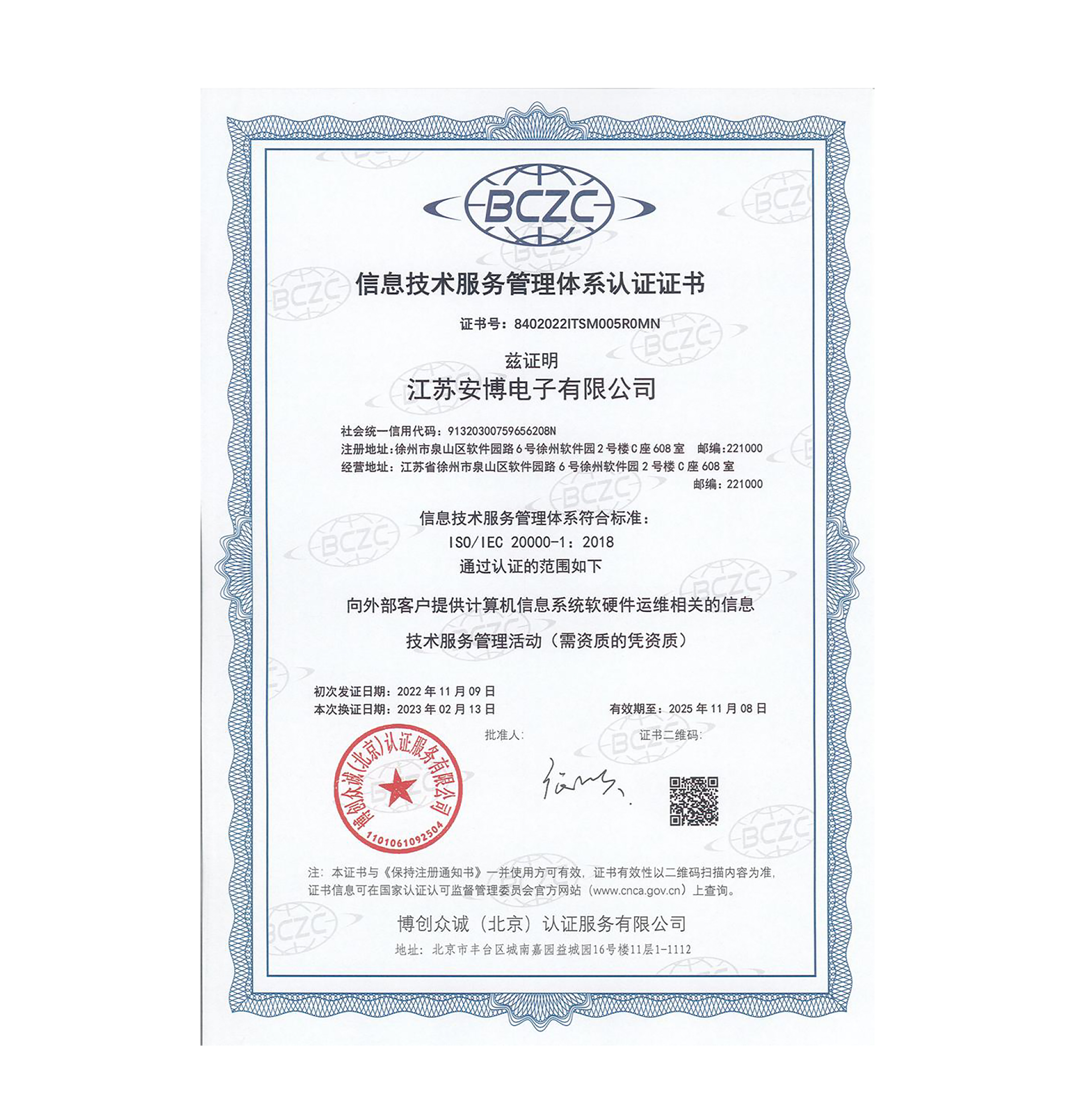 ISO 20000信息技術(shù)服務(wù)管理體系認(rèn)證證書(shū)