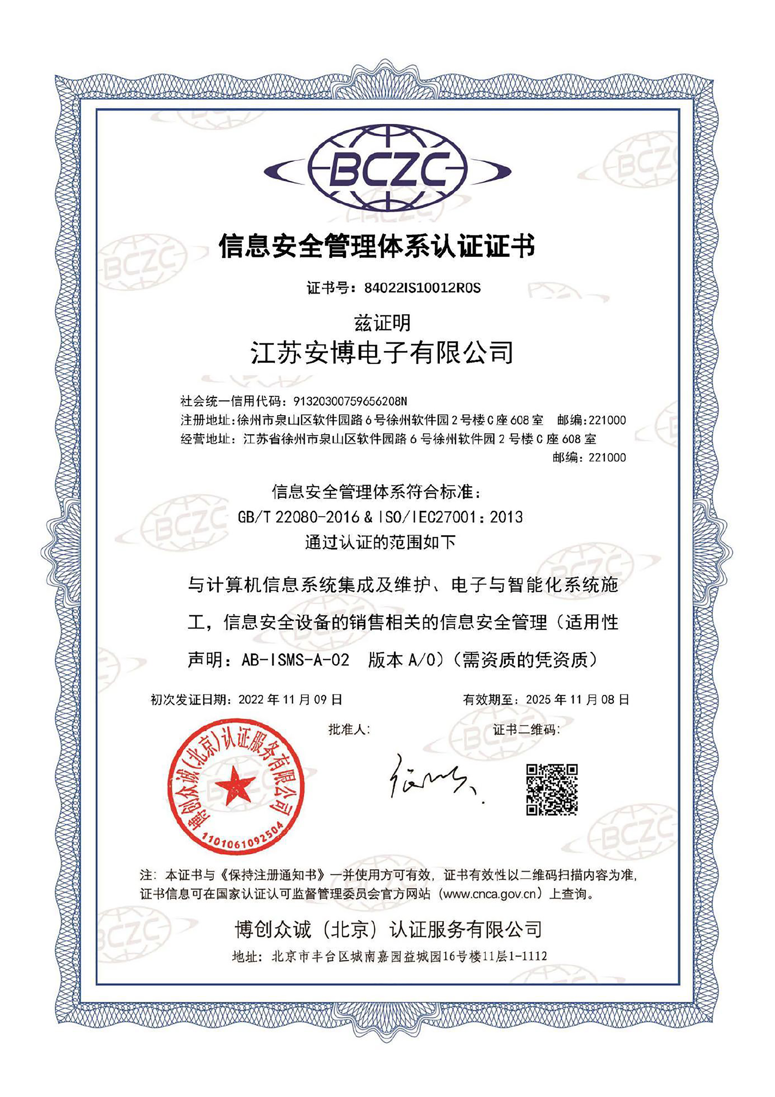 ISO 27001信息安全管理體系認(rèn)證證書(shū)